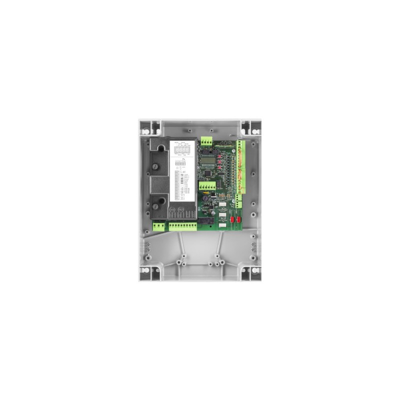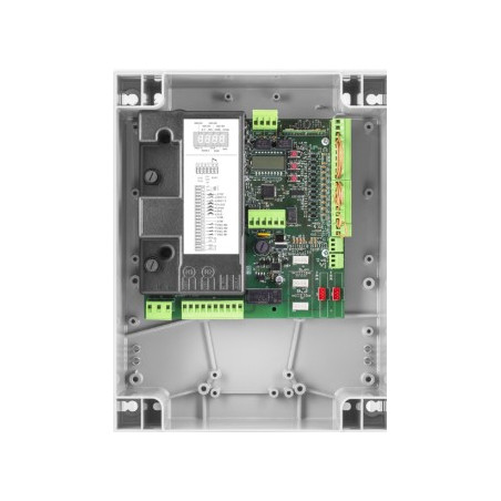 Display LCD integrato | Ricevitore radio integrato 433,92 MHz 512 codici e 3 codifiche radio (Advanced Rolling Code, Rolling Code, Codice Fisso) | Morsettiere estraibili | Logica di funzionamento automatica, semiautomatica e uomo presente | Ingresso encoder per rilevamento ostacoli | Ingressi finecorsa separati per ogni motore | 6 ingressi optoisolati configurabili come apre, chiude, pedonale, passo-passo, stop, fotocellula attiva in apertura-chiusura e fotocellula attiva solo in chiusura | 2 ingressi separati per bordi sensibili configurabili in base al funzionamento e alla tipologia | Uscita per elettroserratura 230 Vac e 12/24 Vdc configurabile | Uscite configurabili come spia segnalazione cancello aperto, secondo canale radio, luce di cortesia, luce di zona, uscita test accessori, uscita lampeggiante, allarme cancello aperto e allarme ingressi NC | Autoset parametri di funzionamento con tutte le tipologie di motore | Regolazione elettronica della coppia separata per ogni motore e dei tempi di lavoro sia in apertura che in chiusura | Regolazione elettronica della coppia con calcolo automatico per ogni punto della corsa (STC SYSTEM) | Rallentamenti regolabili | ESA+ integrato per risparmio energetico | Predisposta per la connessione degli accessori X.BE (KNX) e Q.BE (MQTT) | Configurazione, diagnostica, aggiornamento firmware e gestione radiocomandi attraverso app BeUP, tramite accessorio PRO.UP | Numero manovre | Password di accesso programmazione | Avviso manutenzione | Assorbimento in stand-by conforme al regolamento europeo (EU) 2023/826
