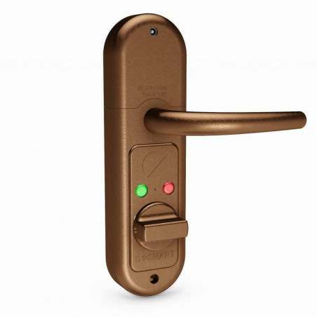 Dispositivo di automazione serratura a batteria, applicabile a tutte le serrature a cilindro europeo con codolo Ø 8 mm. Dimensione placca 230x65x25 mm.